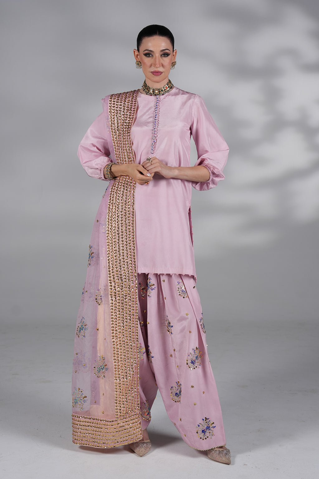 Premium silk shirt with hand embellishments, farshi shalwar with intricate handwork, and chiffon dupatta – a lilac dream for festive evenings.