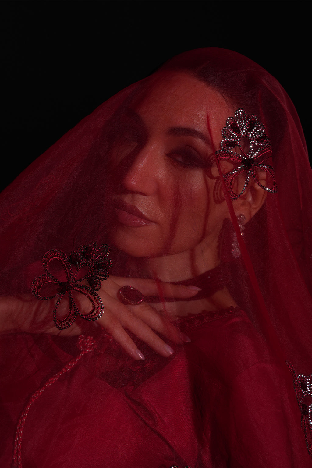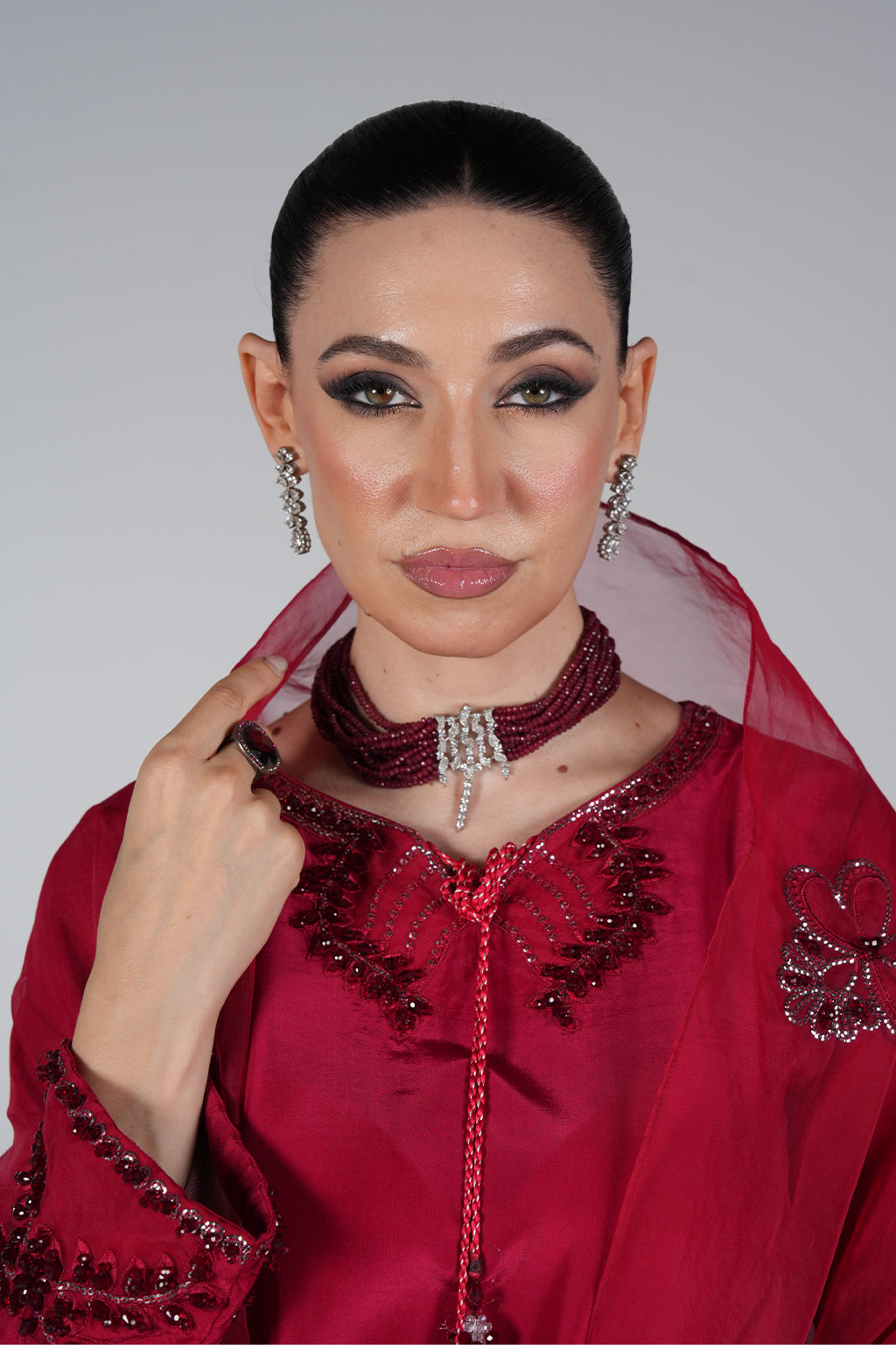 Red premium silk shirt with embroidered neckline & hand-embellished sleeves, paired with silk plazo pant and organza handwork dupatta – a bestseller for festive glam