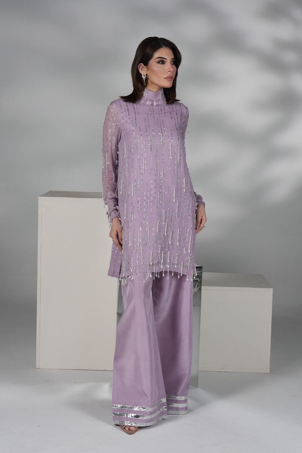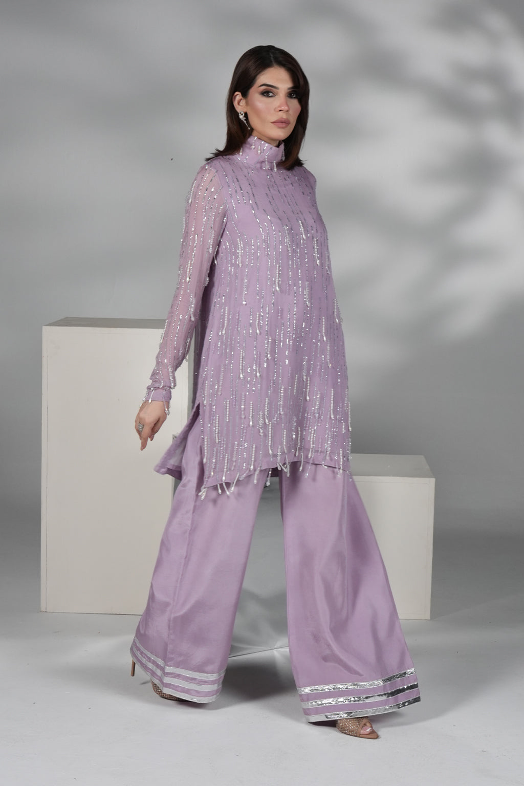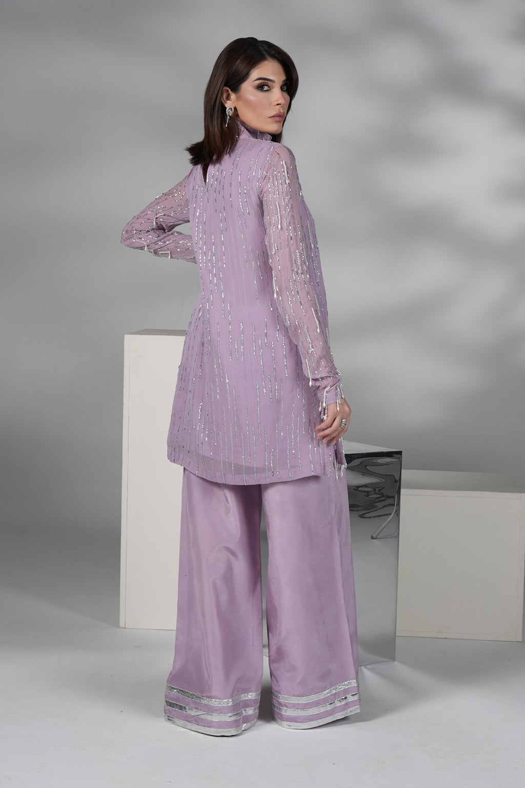 Lilac embroidered chiffon shirt with handwork, paired with premium silk plazo pant with lace detailing.